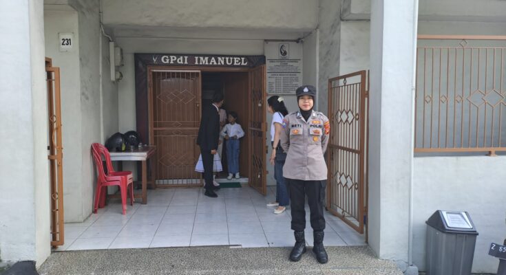 CIAMIS ~ Personel Polres Ciamis Polda Jabar melaksanakan pengamanan kegiatan Ibadah Minggu umat Kristiani/Nasrani di Kabupaten Ciamis. Pengamanan ini dilaksanakan di Gereja Pantekosta di Indonesia (GPdI) Immanuel Ciamis, Jalan Ir. H. Juanda No. 231, Kelurahan Ciamis, Kecamatan Ciamis, Kabupaten Ciamis, Jawa Barat, Minggu (6/4/2025).
