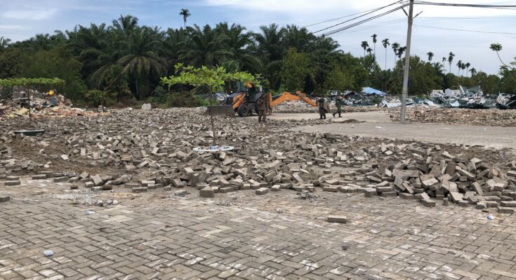 Hingga sore, proses pembongkaran berjalan sesuai rencana. Tercatat, dua rumah panggung kayu, satu garasi, dua pos, satu pondok kecil, serta seluruh paving block berhasil diratakan. Bangunan KTV yang berbahan beton masih tersisa dan akan menjadi fokus eksekusi berikutnya.