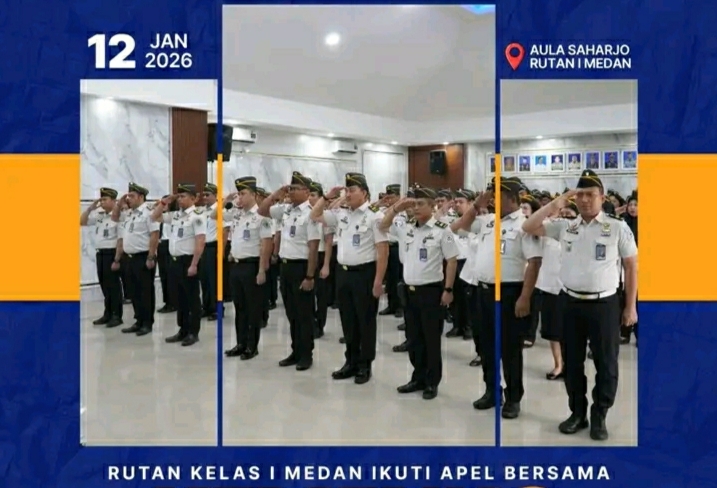 Bara-Medan Rumah Tahanan Negara (Rutan) Kelas I Medan mengikuti kegiatan Apel Bersama Kementerian Koordinator Bidang Hukum, Hak Asasi Manusia, Imigrasi dan Pemasyarakatan Republik Indonesia secara virtual, yang diikuti oleh seluruh jajaran di lingkungan Kemenko Kumham Imipas, Senin (12/1/2026.
