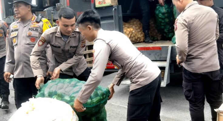 Bantuan terdiri dari Wortel 240 kg, Kentang 180 kg, Cabe merah 180 kg, Tomat 300 kg, Sawi putih 300 kg, Jipang 360 kg, Sarden kaleng 75 dus, Jahe merah 6 karung, Garam 60 bal, Bawang merah 6 karung, Bawang putih 6 karung, Beras 2 goni, Telur 2 papan, Mie instan 4 kotak.