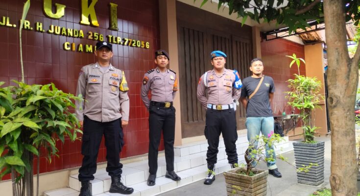 Salah satunya pengamanan yang dilakukan Personel Polsek Ciamis Polres Ciamis Polda Jabar saat pelaksanaan Kebaktian Minggu Pagi di sekitar Gereja Kristen Indonesia Ciamis. Personel bersiaga di sekitar Gereja Kristen Indonesia yang berada di Jl. Ir. H. Juanda No.090, Ciamis, Kabupaten Ciamis, Jawa Barat, Minggu (14/9/2025).