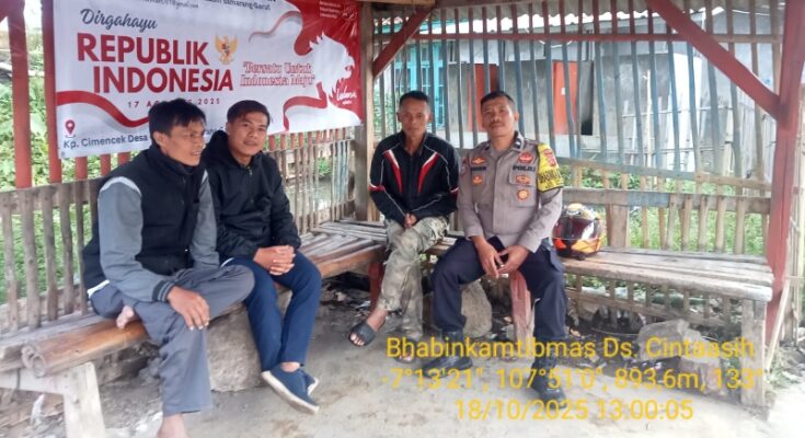Garut Jum’at 18 Oktober 2025. Dalam rangka mendekatkan diri kepada masyarakat serta menyerap aspirasi warga, Bhabinkamtibmas Desa Cintaasih melaksanakan kegiatan Ngariung Kamtibmas bersama warga dan tokoh masyarakat, Bapak Ayi, bertempat di Kampung Cilemah, Desa Cintaasih, Kecamatan Samarang, Kabupaten Garut.