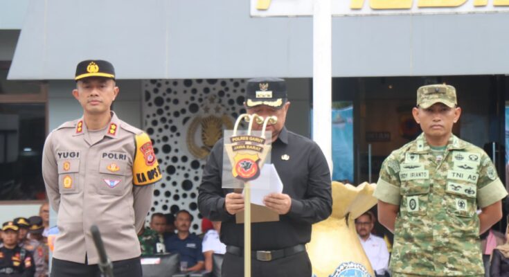 Garut | Bupati Garut Dr. Ir. H. Abdusy Syakur Amin, M.Eng., IPU., di dampingi Kapolres Garut AKBP Yugi Bayu Hendarto, S.I.K., M.A.P., dan dandim 0611 Garut memimpin Apel Gelar Pasukan Operasi Ketupat Lodaya 2025 yang dilaksanakan sebagai bentuk kesiapan pengamanan dan pelayanan masyarakat dalam rangka perayaan Natal 2025 dan Tahun Baru 2026.