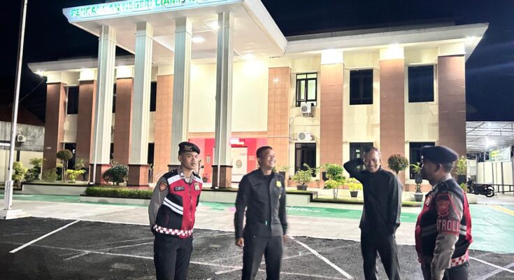 CIAMIS ~ Personel Satuan Samapta Polres Ciamis Polda Jabar melaksanakan patroli kamtibmas ke kawasan objek vital seperti perkantoran di Kabupaten Ciamis. Kegiatan ini sekaligus untuk berkoordinasi dan pembinaan ke satuan keamanan (Satpam) perkantoran. Seperti ini dilakukan ke Anggota Satpam Kantor Pengadilan Negeri Ciamis, Kecamatan Ciamis, Kabupaten Ciamis, Jawa Barat, Jumat (20/2/2026), dini hari.