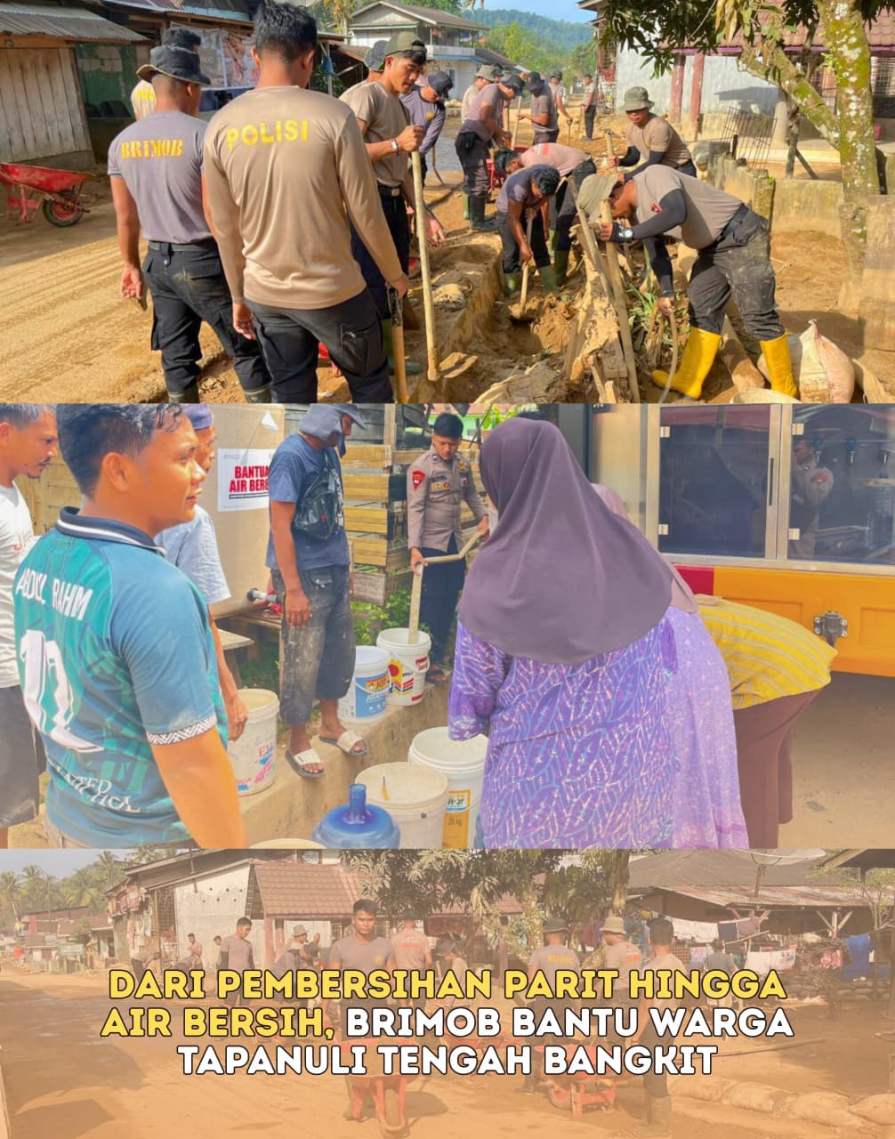 Upaya pemulihan lingkungan dan pemenuhan kebutuhan dasar masyarakat terus dilakukan oleh Satuan Brimob Polda Sumatera Utara di wilayah Tapanuli Tengah. Personel Batalyon A Pelopor melaksanakan dua kegiatan kemanusiaan, yakni pembersihan parit serta pendistribusian air bersih bagi warga yang terdampak kondisi pascabencana, Rabu (21/01/2026).