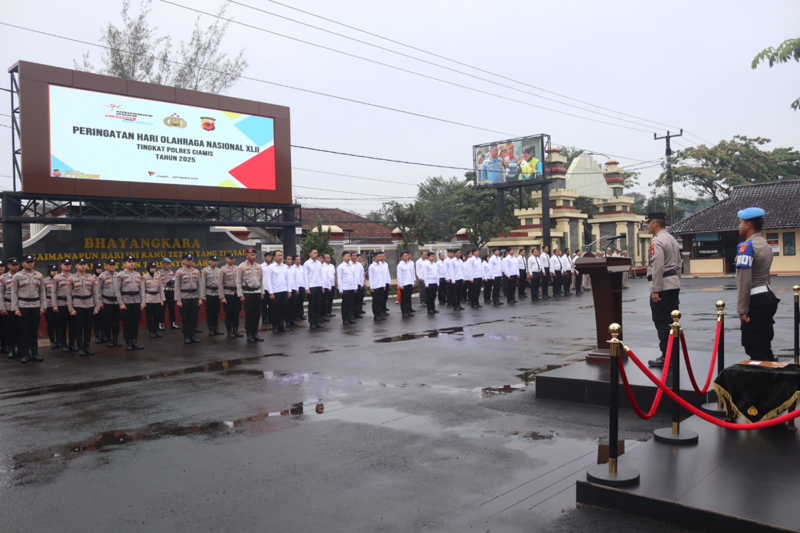 CIAMIS – Peringatan Hari Olahraga Nasional (HAORNAS) ke-42 Tingkat Polres Ciamis dilaksanakan dengan penuh semangat, meskipun upacara yang digelar pada Selasa (9/9/2025) pagi diguyur hujan. Bertempat di halaman Mapolres Ciamis, upacara yang dipimpin oleh Wakapolres Ciamis Kompol Sujana, S.Pd. ini diikuti oleh seluruh jajaran, mulai dari PJU, perwira staf, hingga anggota Polri dan ASN.