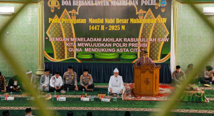 Medan – Suasana khidmat menyelimuti Masjid Al-Hidayah Polda Sumut pada Kamis (4/9/2025), saat jajaran kepolisian bersama tokoh agama dan masyarakat menggelar Doa Bersama Untuk Negeri dan Polri dalam rangka memperingati Maulid Nabi Besar Muhammad SAW 1447 H.