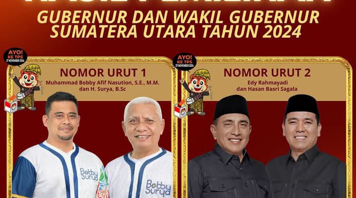 Sumut.Jejak-kriminal.com-Komisi Pemilihan Umum (KPU) telah mengumumkan hasil sementara Pemilihan Gubernur dan Wakil Gubernur Sumatera Utara 2024. Pasangan nomor urut 1, Muhammad Bobby Afif Nasution dan H. Surya*unggul dengan perolehan suara 64,52% (setara dengan 3,43 juta suara). Pasangan ini diusung oleh koalisi besar partai, termasuk Partai Golkar, Gerindra, PAN, NasDem, dan lainnya.