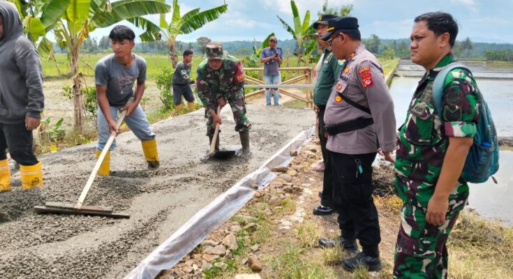 CIAMIS ~ Personel Polsek Lakbok Polres Ciamis Polda Jabar melaksanakan humanis dengan mendatangi dan ikut membantu kegiatan masyarakat berupa pembangunan jalan rabat beton di Desa Sukamulya. Pembangunan jalan ini berada di Dusun Karangtengah, RT 22 / RW 03, Desa Sukamulya, Kecamatan Purwadadi, Kabupaten Ciamis, Jawa Barat, Selasa (13/1/2026).