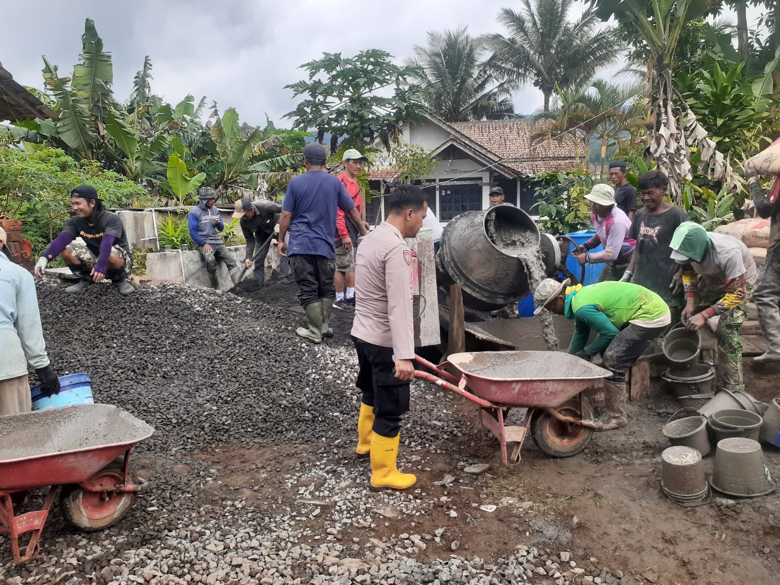CIAMIS ~ Personel Polsek Panjalu Polres Ciamis Polda Jabar melaksanakan humanis dengan mendatangi dan ikut membantu kegiatan masyarakat berupa pembangunan jalan rabat beton di Desa Cibeureum. Pembangunan jalan ini berada di Dusun Nusasireum, Desa Cibeureum, Kecamatan Sukamantri, Kabupaten Ciamis, Jawa Barat, Minggu (23/11/2025).