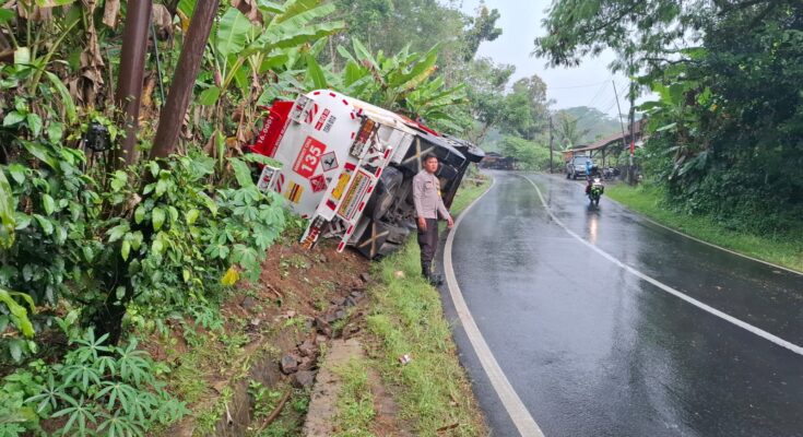 CIAMIS ~ Jajaran Polsek Cimaragas Polres Ciamis Polda Jabar mendatangi TKP laka lantas tunggal kendaraan muatan Bahan Bakar Minyak yang akan menuju Kabupaten Pangandaran. Peristiwa ini terjadi di Jalan Raya Tasikmalaya-Cimaragas pada, Senin, 23 Juni 2025, kemarin.