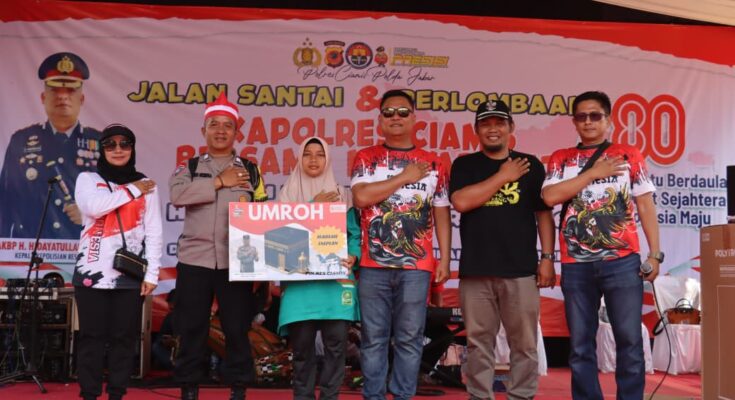 Ciamis – Dalam semangat memeriahkan Hari Ulang Tahun (HUT) Kemerdekaan Republik Indonesia ke-80, Polres Ciamis menggelar acara jalan santai dan berbagai perlombaan di lapangan Desa Jalatrang, Kecamatan Cipaku, Sabtu (16/8/2025). Acara yang dipimpin langsung oleh Kapolres Ciamis AKBP H. HIDAYATULLAH, S.H., S.I.K. ini berlangsung meriah dan dipadati sekitar 5.000 warga yang antusias.