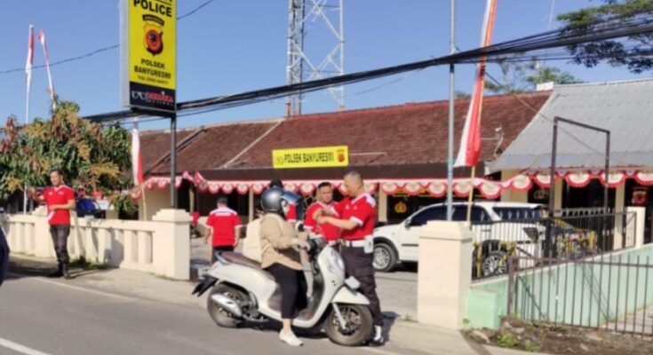 Garut – Menjelang peringatan HUT Kemerdekaan RI ke-80, jajaran Polsek Banyuresmi yang dipimpin langsung Kapolsek Banyuresmi AKP Usep Heryaman, S.IP, S.Pd.I. menggelar kegiatan pembagian bendera Merah Putih kepada masyarakat pada Jumat (15/8/2025).