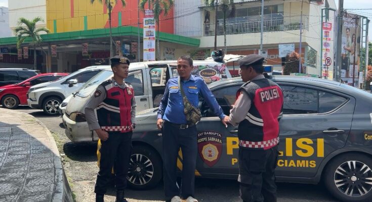 Terlihat para personel Unit Satuan Sampta Polres Ciamis Polda Jabar dengan memanfaatkan fasilitas Kendaraan Dinas Polri berupa pengeras suara menyampaikan pesan-pesan kamtibmas. Terutama untuk selalu tetap waspada terhadap tindak kriminalitas dan gangguan kamtibmas lainnya. Himbauan ini disampaikan di kawasan Simpang Empat Yogya Ciamis, Ciamis, Kabupaten Ciamis, Jawa Barat, Sabtu (20/12/2025).