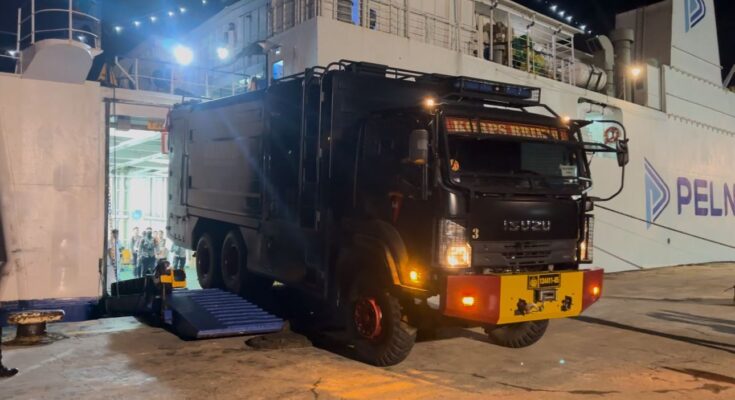 Dalam proses tersebut, satu unit truk dinas Korbrimob Polri digunakan untuk membongkar muatan bantuan logistik, kemudian kembali ke kapal untuk melanjutkan pengangkutan logistik dan personel ke wilayah tujuan berikutnya.