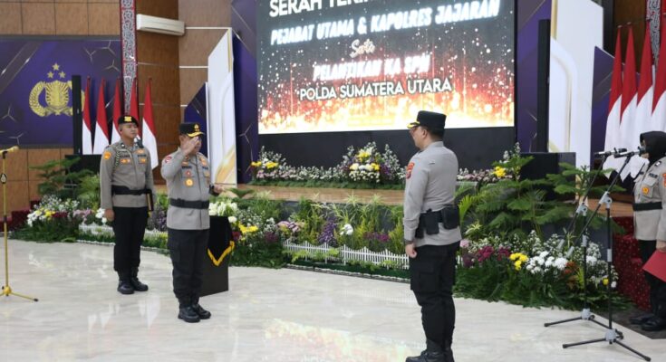 Medan Kapolda Sumatera Utara Irjen Whisnu Hermawan Februanto melakukan serah terima jabatan (Sertijab) Pejabat Utama dan lima Para Kapolres Jajaran di Aula Tribarata Mapolda Sumut, Rabu, 09 Juli 2025.