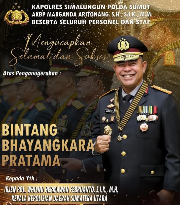 Jejak-kriminal.com // SIMALUNGUN SUMUT – Kapolres Simalungun AKBP Marganda Aritonang, S.H., S.I.K., M.M., berserta seluruh personel Polres Simalungun dengan penuh kebanggaan menyampaikan ucapan selamat dan sukses atas penganugerahan Tanda Kehormatan Bintang Bhayangkara Pratama kepada Kepala Kepolisian Daerah Sumatera Utara, Irjen Pol. Whisnu Hermawan Februanto, S.I.K., M.H. Penghargaan bergengsi tersebut diserahkan langsung oleh Kapolri Jenderal Polisi Drs. Listyo Sigit Prabowo, M.Si., dalam upacara penganugerahan yang berlangsung khidmat di Rupatama Mabes Polri, Jakarta, pada hari Selasa, 11 November 2025.