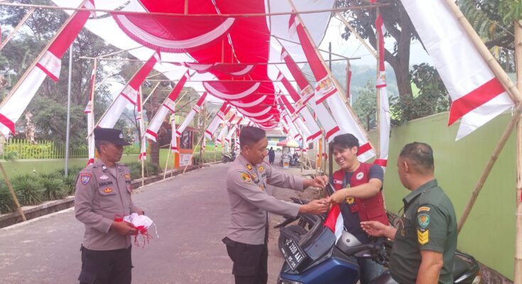 Garut – Menyambut Hari Ulang Tahun (HUT) Kemerdekaan Republik Indonesia ke-80, Kapolsek Leles AKP Wawan bersama personel Polsek Leles melaksanakan kegiatan pembagian serta pemasangan bendera merah putih kepada pengendara kendaraan bermotor dan warga masyarakat, Senin (11/8/2025).