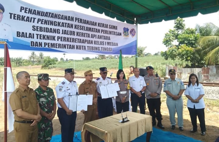 Jejak-kriminal.com || Tebing Tinggi Sumut – Sebagai komitmen peningkatan keselamatan perlintasan sebidang jalur kereta api, Kapolres Tebing Tinggi diwakili Kasat Lantas Polres Tebing Tinggi AKP Lidya, S.Trk, SIK, MH menghadiri penandatanganan Memorandum of Understanding (MoU) atau nota kesepakatan antara Pemko Tebing Tinggi dengan Balai Teknik Perkeretaapian Indonesia Tingkat 1 Medan bertempat di Jalan Abdul Hamid Kecamatan Padang Hilir Kota Tebing Tinggi, Selasa (10/2/2026).