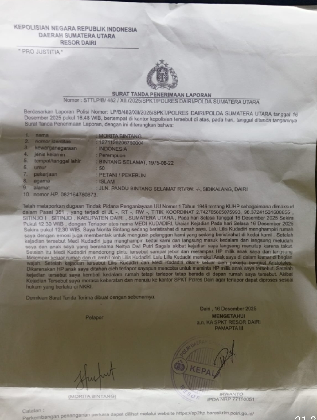 Berdasarkan penelusuran, laporan tersebut telah resmi masuk ke Sentra Pelayanan Kepolisian Terpadu (SPKT) Polres Dairi sejak beberapa waktu lalu. Namun hingga kini, proses hukum dinilai stagnan tanpa kejelasan status penyidikan.