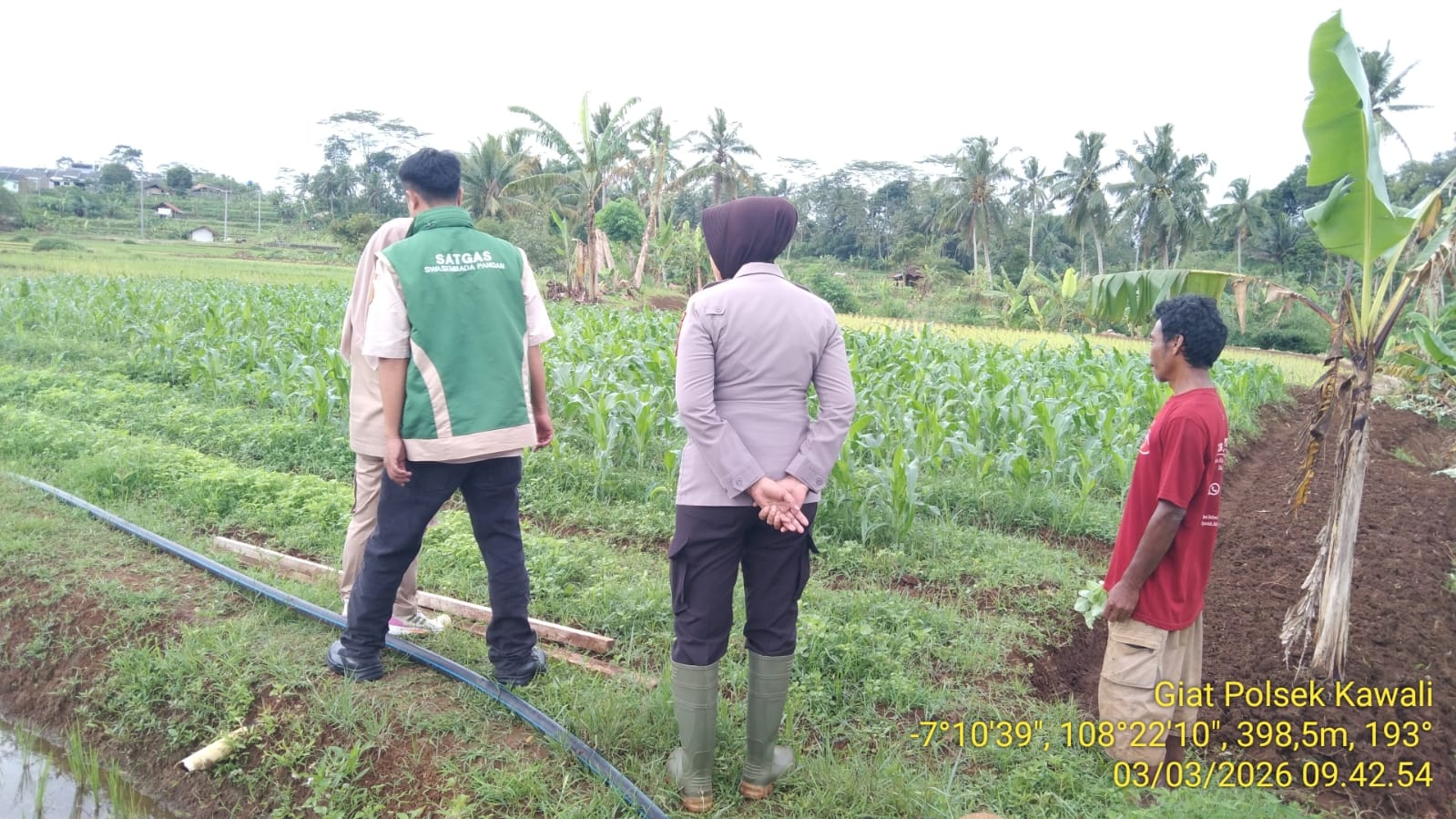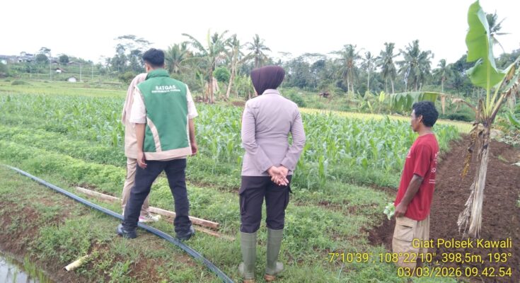 CIAMIS ~ Polsek Kawali Polres Ciamis Polda Jabar turut serta melakukan pemantauan maupun pendampingan pertanian jagung di Desa Kawalimukti dalam upaya mendukung program ketahanan pangan nasional. Pertanian jagung ini berada di area pertanian warga di Blok Gunung Putri Dusun Kilayugung, Desa Kawalimukti, Kecamatan Kawali, Kabupaten Ciamis, Jawa Barat, Rabu (4/3/2026).