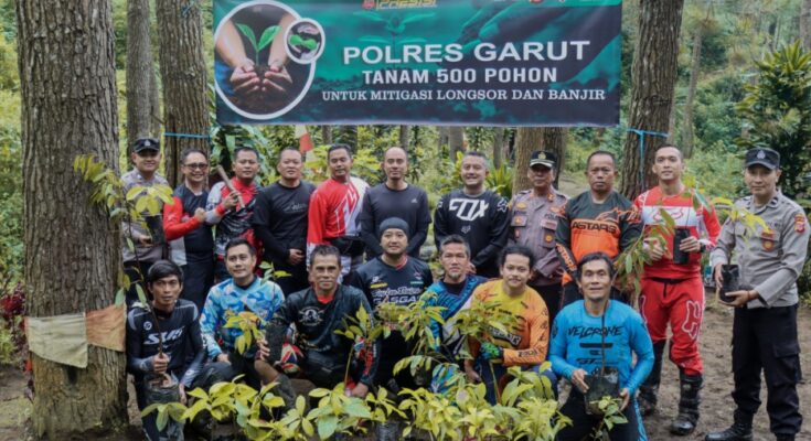 Garut – Kapolres Garut AKBP Yugi Bayu Hendarto bersama Wakapolres Garut Kompol Bayu Tri Nugraha dan para Pejabat Utama (PJU) Polres Garut, bersama komunitas trail melaksanakan kegiatan penanaman pohon sebagai upaya mitigasi bencana longsor dan banjir di kawasan wisata Batu Lempar, Kabupaten Garut. Minggu (11/1/2-26).