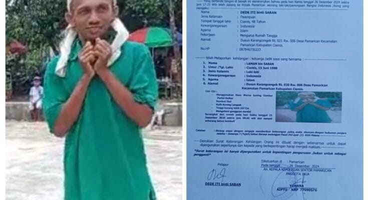 Seorang pria bernama Laman (36), warga du Dusun Karangcengek, RT 20, RW 06, Desa Pamarican, Kecamatan Pamarican, Kabupaten Ciamis, Jawa Barat, dilaporkan hilang tanpa kabar oleh Kakaknya yang bernama Dede Iti (48).