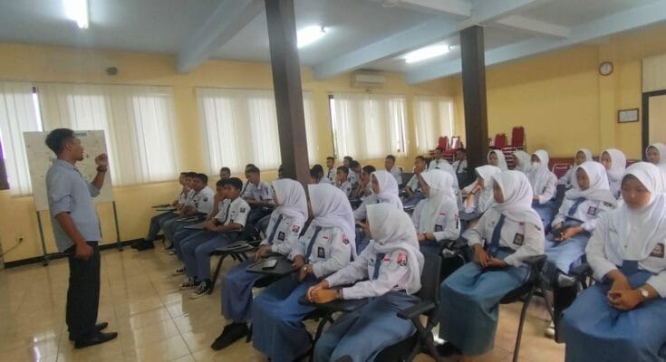 Tampak sejumlah anggota Sat Res Narkoba Polres Ciamis Polda Jabar memberikan penyuluhan sekaligus edukasi tentang bahaya penyalahgunaan narkoba kepada ribuan pelajar di SMKN 2 Ciamis. Sementara anggota yang hadir memberikan penyuluhan, yakni Bripka Endi Agustia.