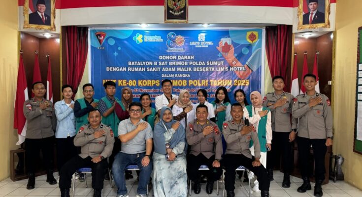 Jejak-kriminal.com // Tebingtinggi Sumut – Dalam rangka menyambut Hari Ulang Tahun Korps Brimob Polri ke-80, Personil Batalyon B Pelopor Satuan Brimob Polda Sumut melaksanakan bakti sosial dengan mengadakan kegiatan Donor Darah yang berlangsung di Mako Batalyon B Kota Tebingtinggi, Senin (03/11/2025).