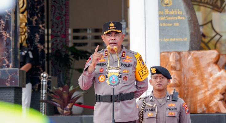 Medan – Kepala Kepolisian Daerah Sumatera Utara, Irjen Pol Whisnu Hermawan F., S.I.K., M.H., memimpin langsung Apel Gelar Pasukan Operasi Kepolisian Kewilayahan “Patuh Toba 2025” yang digelar di Lapangan KS Tubun Mapolda Sumut, Senin (14/7/2025).