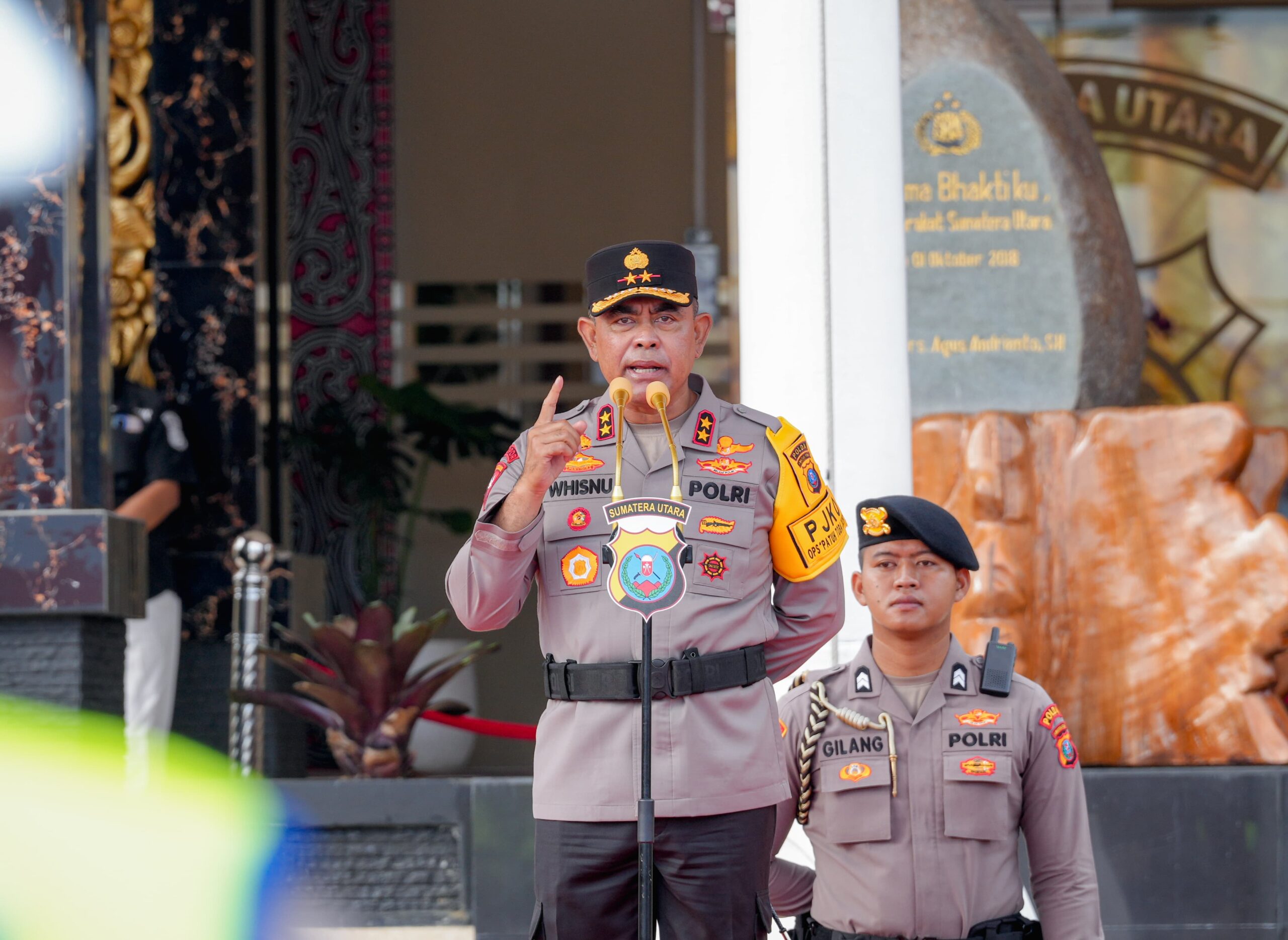 Medan – Kepala Kepolisian Daerah Sumatera Utara, Irjen Pol Whisnu Hermawan F., S.I.K., M.H., memimpin langsung Apel Gelar Pasukan Operasi Kepolisian Kewilayahan “Patuh Toba 2025” yang digelar di Lapangan KS Tubun Mapolda Sumut, Senin (14/7/2025).