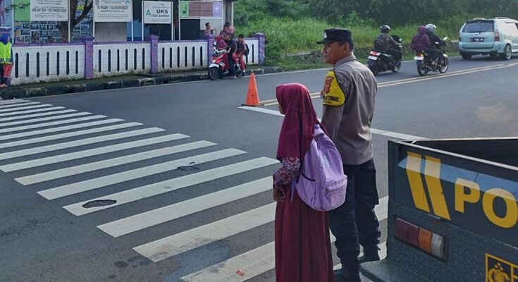CIAMIS ~ Polsek Cijeungjing Polres Ciamis Polda Jabar melaksanakan kegiatan pelayanan masyarakat di pagi hari berupa pengaturan arus lalu lintas dengan sasaran anak sekolah. Kegiatan ini dilaksanakan Depan SDN 1 Bojongmengger di Jalan Raya Ciami-Banjar, Desa Bojongmengger, Kecamatan Cijeungjing, Kabupaten Ciamis, Jawa Barat, Kamis (5/6/2025).
