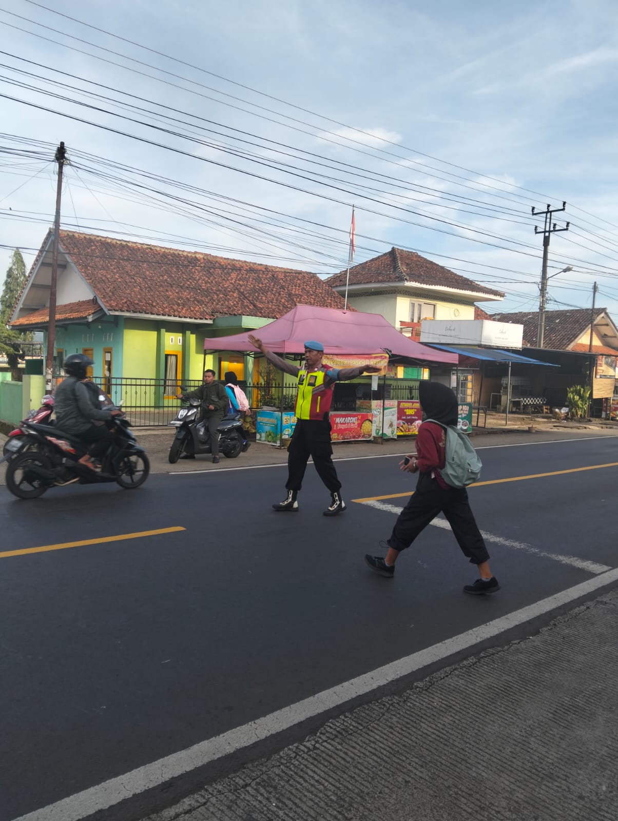 Mereka hadir memberikan pelayanan kepada masyarakat. Mulai dari membantu masyarakat menyebrang hingga pengaturan lalu lintas di pagi hari.