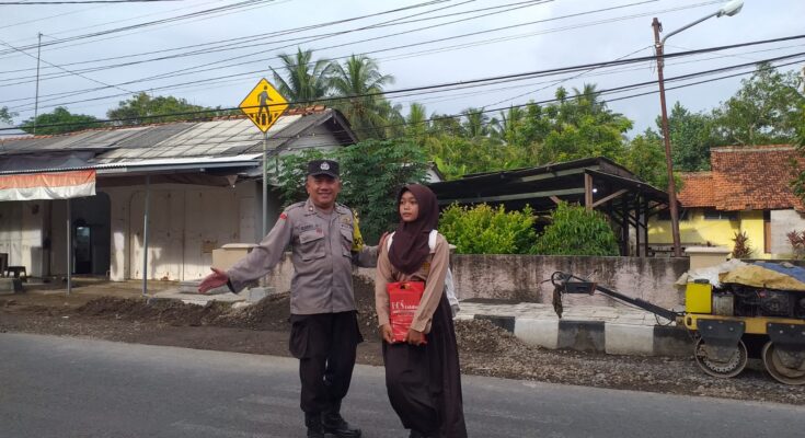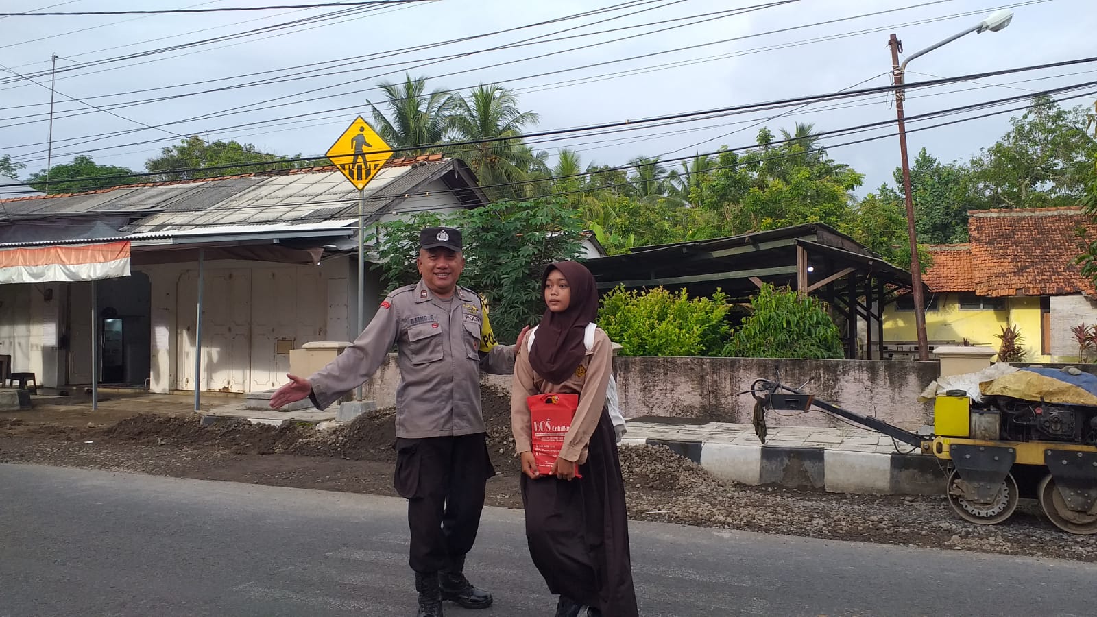 Tampak terlihat Aiptu Ujang Ruhyana anggota Polsek Lakbok Polres Ciamis Polda Jabar memberikan pelayanan masyarakat di pagi hari. Anggota hadir untuk melakukan pengaturan lalu lintas dan membantu warga menyebrang.