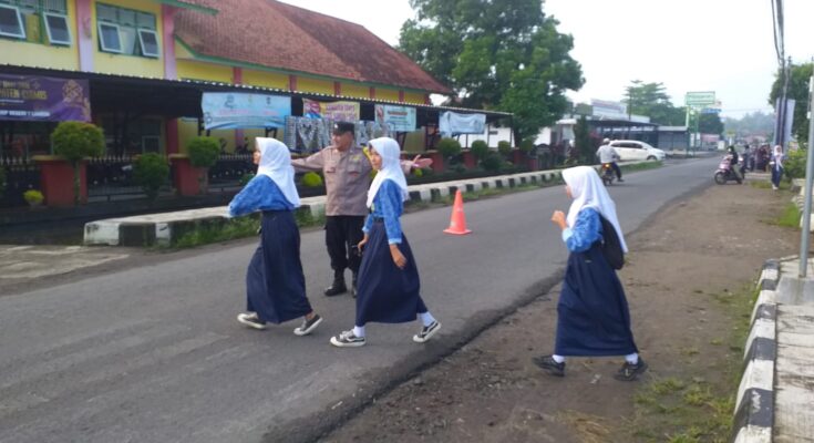 Tampak terlihat anggota Polsek Lakbok Polres Ciamis Polda Jabar memberikan pelayanan masyarakat di pagi hari. Anggota hadir untuk melakukan pengaturan lalu lintas dan membantu warga menyebrang.