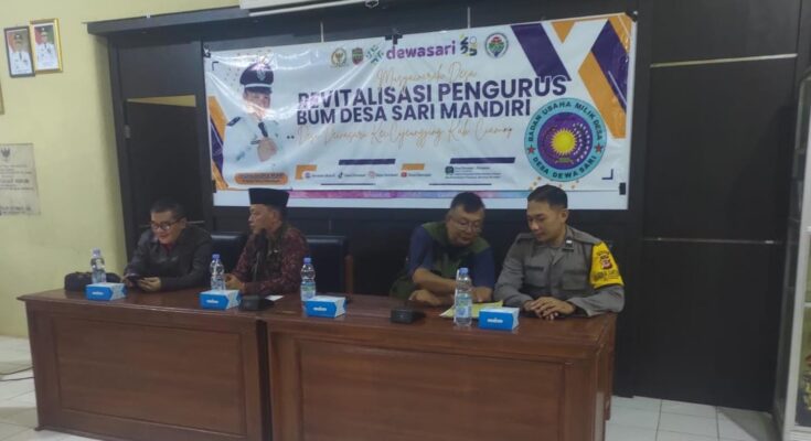 CIAMIS ~ Personel Polsek Cijeungjing Polres Ciamis Polda Jabar melaksanakan koordinasi dan komunikasi bersama warga dalam rangka cipta kondisi antisipasi gangguan kamtibmas. Ini dilakukan saat momen sekaligus mengikuti Musyawarah Desa Revitalisasi Pengurus Bumdesa Sari Mandiri Desa Dewasari. Acara ini berlangsung di Aula Kantor Desa Dewasari, Kecamatan Cijeungjing, Kabupaten Ciamis, Jawa Barat, Jumat (4/7/2025).