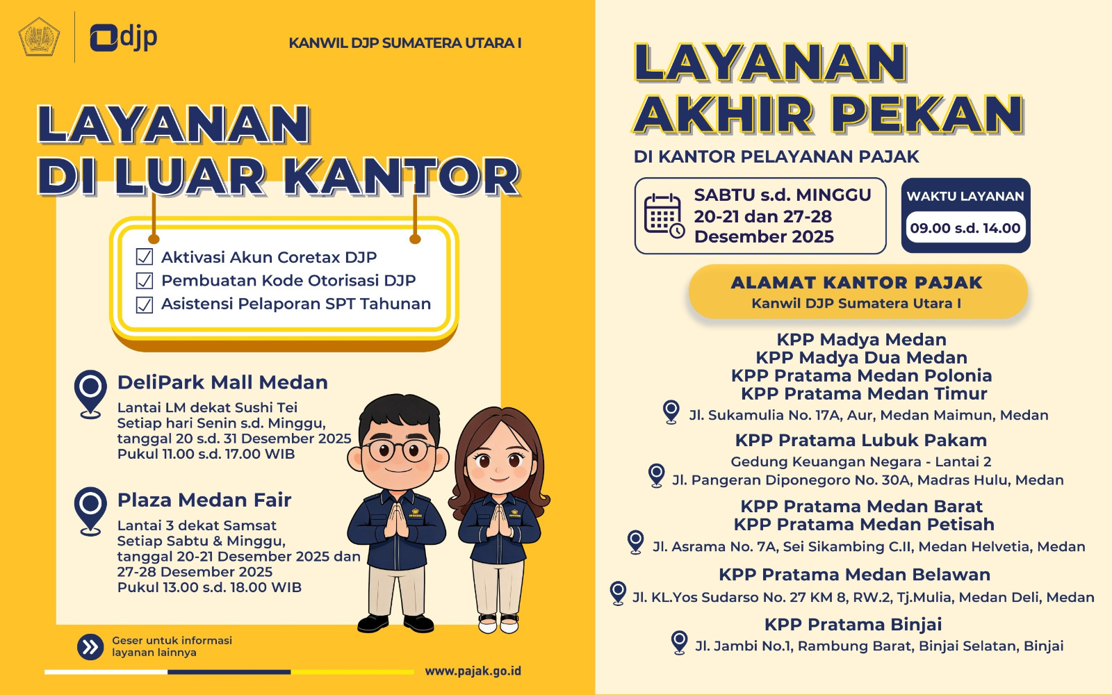 Sebagai bentuk komitmen pelayanan, Kantor Wilayah Direktorat Jenderal Pajak Sumatera Utara I membuka layanan Aktivasi Akun Coretax DJP, Pembuatan Kode Otorisasi DJP, serta Asistensi Pelaporan SPT Tahunan bagi masyarakat. Kegiatan ini disiapkan untuk memastikan wajib pajak di wilayah kerja Kanwil DJP Sumatera Utara I dapat memperoleh akses layanan aktivasi, bahkan di luar hari kerja sekalipun.