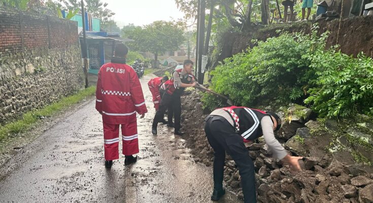 CIAMIS ~ Personel Satuan Samapta Polres Ciamis Polda Jabar mendatangi lokasi bencana alam tanah longsor di wilayah Karanggedang. Kedatangannya untuk melakukan pengamanan sekaligus pembersihan material tanah longsor yang menutupi sebagian jalan desa.