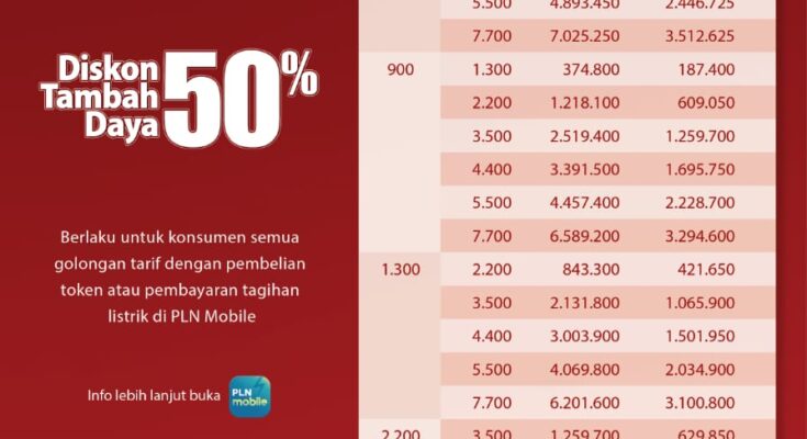 Melalui program bertajuk “Bangkit Lebih Terang”, pelanggan PLN dapat menikmati promo tambah daya ini yaitu pelanggan mulai dari daya 450 VA hingga 5.500 VA. Diskon yang diberikan mencapai hingga 50% dari biaya normal tergantung pada daya yang dipilih. Program ini berlaku mulai tanggal 10 hingga 23 Mei 2025, dan dapat diakses melalui aplikasi PLN Mobile. Promo ini juga ditujukan bagi konsumen semua golongan tarif dengan melakukan pembelian token atau pembayaran tagihan listrik di PLN Mobile. Proses pendaftaran dilakukan secara digital melalui aplikasi PLN Mobile guna memudahkan dan mempercepat pelayanan.