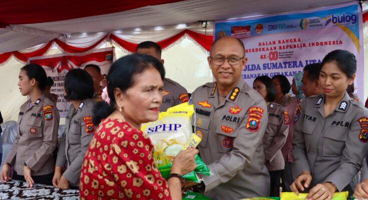 Belawan – Polda Sumut bersama Polres Pelabuhan Belawan melaksanakan kegiatan Minggu Kasih dan Gerakan Pangan Murah (GPM) di Gereja HKBP Pajak Baru Belawan pada Minggu (10/8).