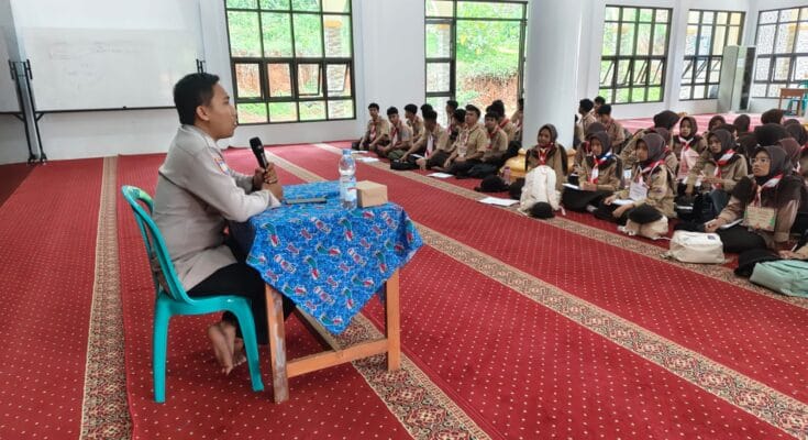Tampak dua personel Polsek Rajadesa Polres Ciamis Polda Jabar hadir memberikan edukasi dan penyuluhan bahaya bullying saat menjadi narasumber di SMKN 1 Rajadesa. Kedua personel yang hadir diantaranya Bripka Dirman Nurzaman dan Bripda Dodi Hidayatur Rohman.