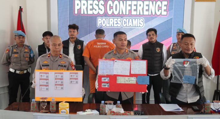 Ciamis – Polres Ciamis kembali menunjukkan komitmennya dalam menegakkan hukum dan menjaga ketertiban masyarakat. Melalui kegiatan konferensi pers yang digelar pada Senin (26/5/2025) pukul 10.00 WIB hingga 11.00 WIB, Kapolres Ciamis AKBP Akmal, S.H., S.I.K., M.H. didampingi oleh Wakapolres Kompol Sujana, S.Pd., dan Kasat Reskrim AKP Carsono, S.H. mengumumkan keberhasilan pengungkapan kasus tindak pidana pemalsuan surat, khususnya pembuatan dan penggunaan SIM B II Umum palsu.