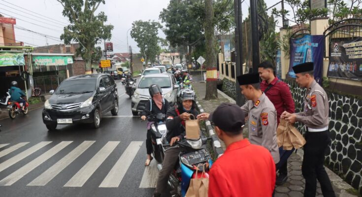 Dalam suasana penuh keakraban, anggota kepolisian bersama para mahasiswa turun langsung ke jalan membagikan paket takjil kepada para pengendara dan masyarakat yang melintas.