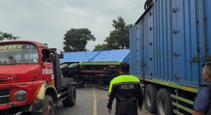 Garut | Sebuah truk bermuatan mie instan mengalami kecelakaan hingga terguling di kawasan Tanjakan Andir, Kecamatan Malangbong, Kabupaten Garut, pada Minggu (08/03/2026) sekitar pukul 08.00 WIB. Kejadian tersebut sempat menyebabkan kemacetan panjang di jalur utama Bandung–Tasikmalaya.