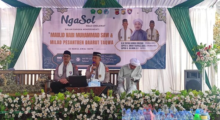 Garut – Dalam rangka memperingati Maulid Nabi Muhammad SAW dan Milad Pondok Pesantren Daarut Taqwa, Sat Binmas Polres Garut menyelenggarakan kegiatan NGASOL (Ngaji dan Sholawat bersama Polisi) di Ponpes Daarut Taqwa, Kampung Sapaan, Desa Galihpakuwon, Kecamatan Bl. Limbangan, Kabupaten Garut, pada Selasa (16/9/2025).