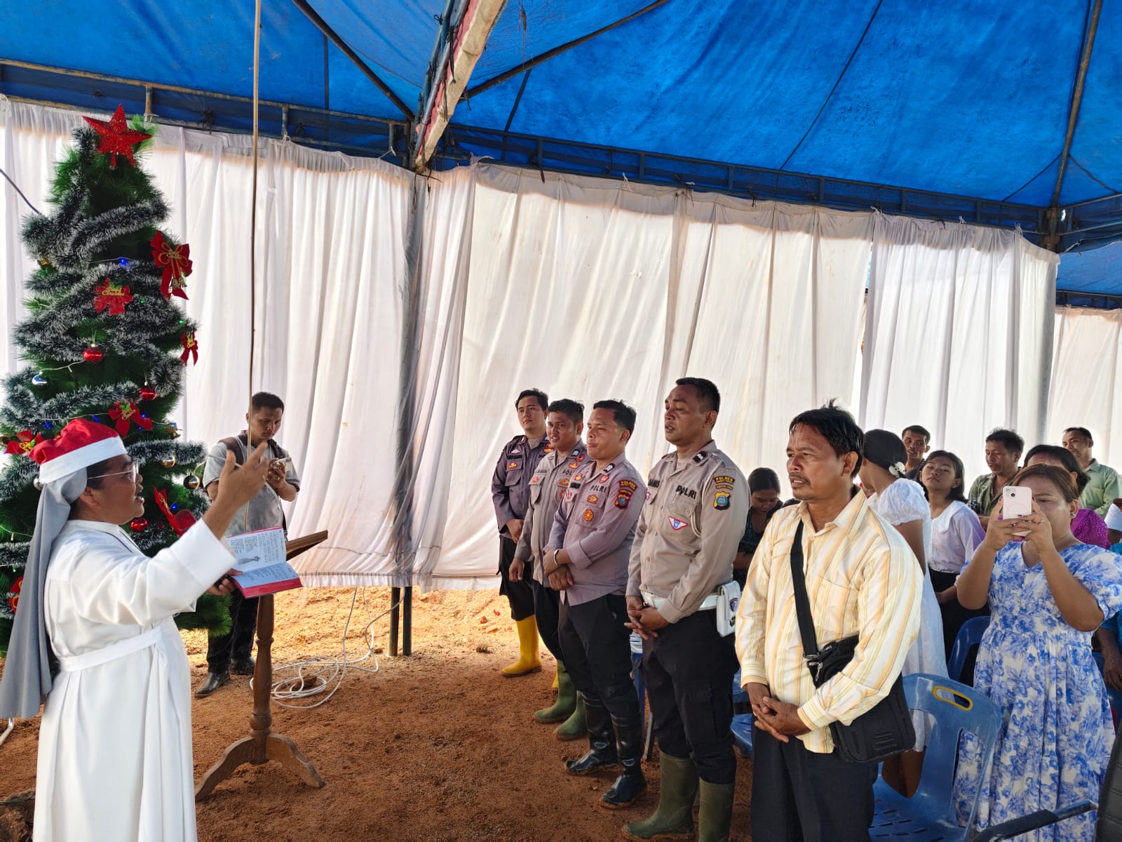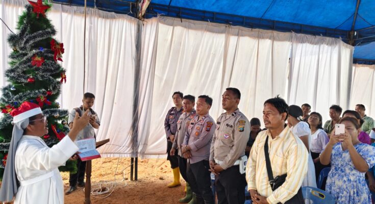 Polres Tapanuli Tengah memfasilitasi Perayaan Natal bersama para pengungsi korban bencana alam di Posko Pengungsian Simpang Sipange, Hutanabolon, Kelurahan Tukka, Kecamatan Tukka, Kabupaten Tapanuli Tengah, Rabu malam (24/12/2025).