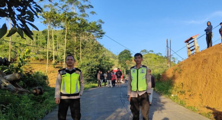 Garut | Polsek Banjarwangi Polres Garut melakukan pengamanan lokasi kejadian tumbangnya tiang listrik yang terjadi di Jalan Raya Banjarwangi–Singajaya tepatnya di Lawang Angin, Kampung Patrol, Desa Tanjungjaya, Kecamatan Banjarwangi. Selasa (23/12/25).