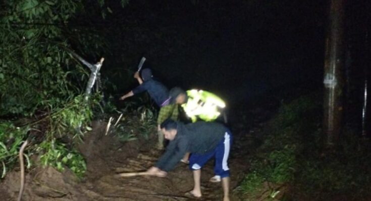 Garut – Personel Polsek Banjarwangi Polres Garut melaksanakan evakuasi material tanah longsor yang menutup sebagian badan jalan di wilayah Kecamatan Banjarwangi, Kabupaten Garut. Sabtu (21/2/2026) malam.