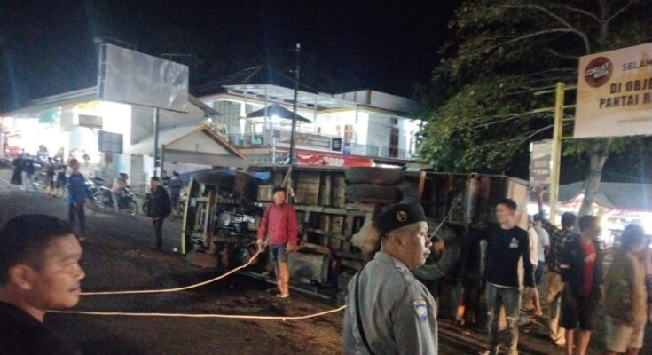 Sebuah truk R4 berwarna kuning dengan nomor polisi D 7279 AI mengalami insiden terbalik usai hilang keseimbangan akibat muatan kayu batangan yang melebihi kapasitas atau overload. Kendaraan tersebut dikemudikan oleh Tatang (45), warga Desa Cibongas, Kecamatan Pancatengah, Kabupaten Tasikmalaya, yang juga menjadi korban luka ringan dalam peristiwa tersebut, bersama Tatang, turut serta seorang kenek bernama Ivan (28), warga Kp. Cilayu, Desa Samuderajaya, Kecamatan Caringin, yang selamat tanpa luka serius.