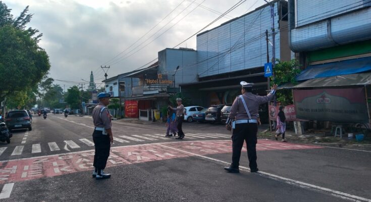 Pengaturan lalu lintas dilakukan oleh Aiptu Didin S. SH dan Aipda Aris Henji A yang hadir langsung di lokasi untuk membantu kelancaran arus kendaraan serta memberikan perlindungan bagi warga dan pelajar yang hendak menyeberang. Kehadiran petugas pada jam keberangkatan sekolah dinilai sangat krusial mengingat tingginya mobilitas masyarakat di sekitar kawasan pendidikan tersebut.